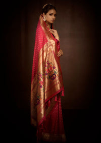 Ruby Red Zari Woven Traditional Peshwai Paithani Silk Saree With Swarovski Work