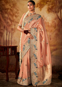 Peach Zari Woven Heavy Embroidered Designer Kanjivaram Silk Saree