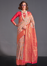 Peach Resham Woven Kashmiri Jamewar Silk Saree