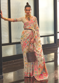 Pearl White Woven Pure Handloom Kashmiri Jamewar Silk Saree
