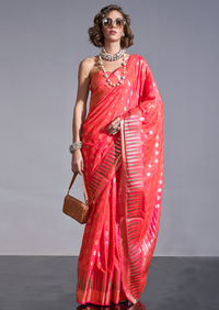 Coral Red Zari Woven Pure Handloom Gadwal Banarasi Silk Saree