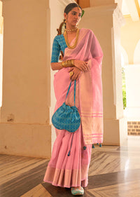Carnation Pink Zari Woven Handloom Linen Tissue Silk Saree