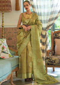 Olive Green Zari Woven Pure Handloom Satin Tissue Silk Saree