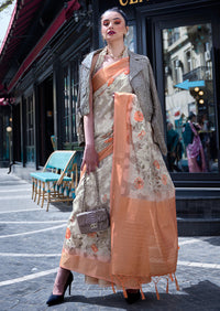 Pearl White Woven Printed Brasso Handloom Silk Saree