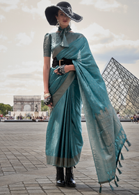 Light Teal Blue Zari Woven Handloom Pure Banarasi Satin Silk Saree
