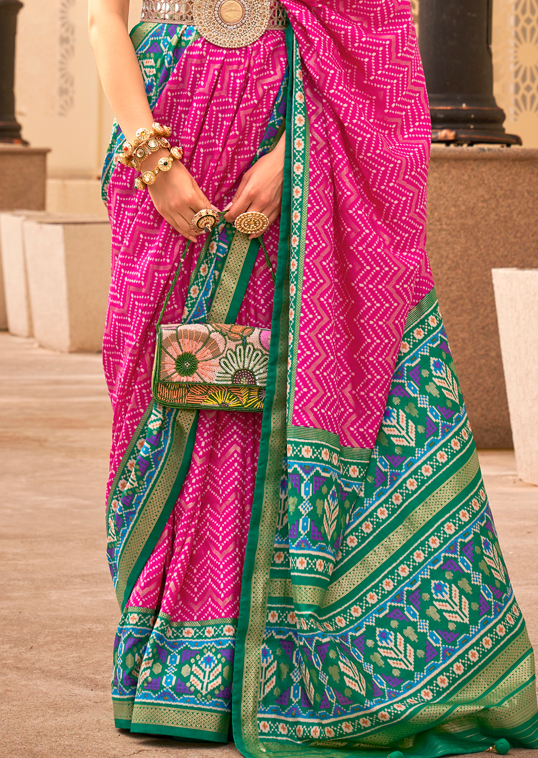 Deep Pink & Green Woven Patola Silk Saree