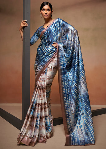 Steel Blue Woven Digital Printed Satin Crepe Silk Saree