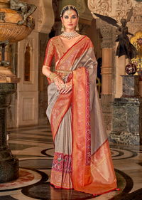 Cloud Grey & Red Woven Royal Patola Kanjivaram Silk Saree