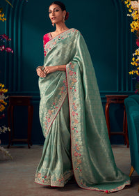 PERSIAN GREEN HEAVY EMBROIDERED BROCADE DESIGNER KANJIVARAM SILK SAREE