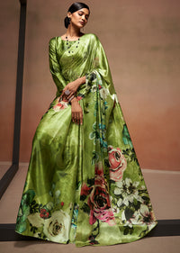 Olive Green Woven Digital Printed Satin Crepe Silk Saree