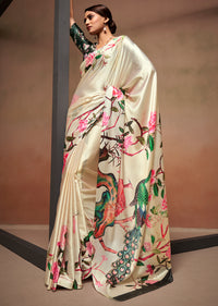 Cream White Woven Digital Printed Satin Crepe Silk Saree