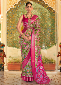 Indulge in luxury with the Olive Green Woven Royal Traditional Patola Silk Saree. Crafted with exquisite Patola silk, this saree exudes elegance and sophistication. The beautiful olive green color adds a touch of royalty, making it a perfect choice for any special occasion. Elevate your style and make a statement with this premium saree.