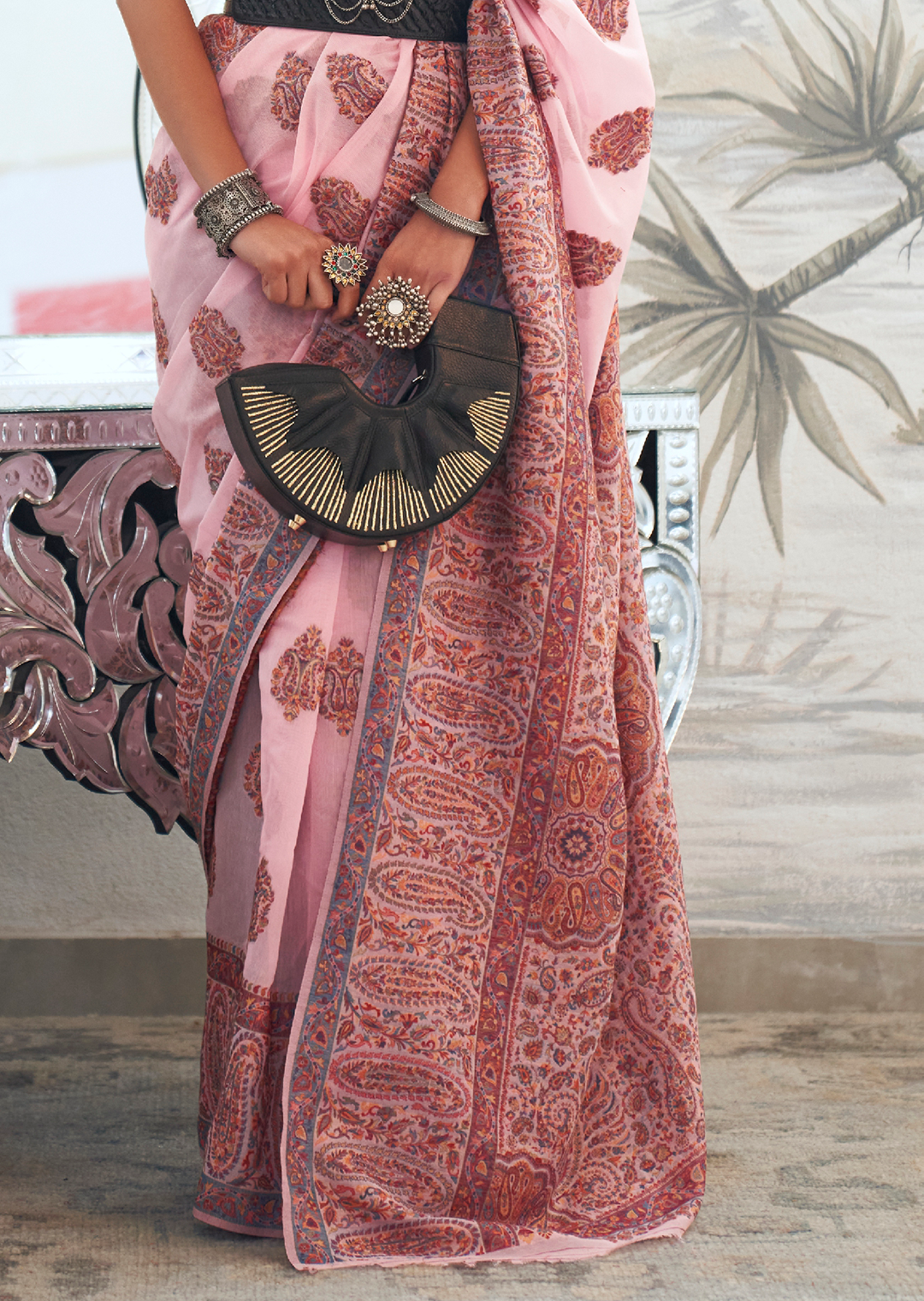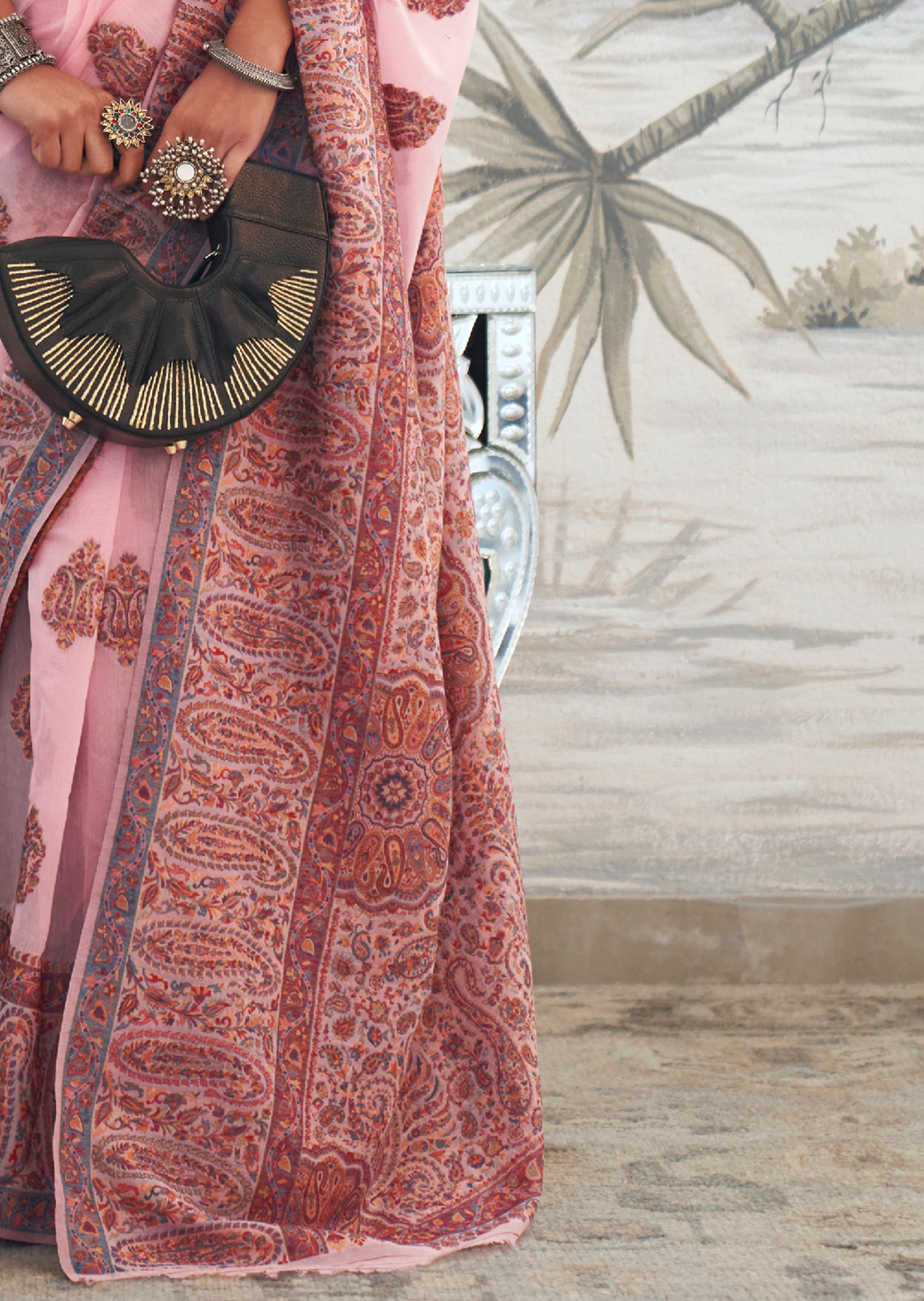 Carnation Pink Woven Pure Handloom Kashmiri Jamewar Saree